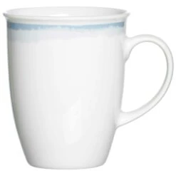 - Auf jedem Becher ist oben eine mittelblaue Linie, die verspielt in eine breite hellblaue Linie übergeht und an die sich brechenden Wellen am Strand erinnert Der Rest des Bechers, sowie die Innenseite und der Henkel sind schlicht in Weiß gehalten