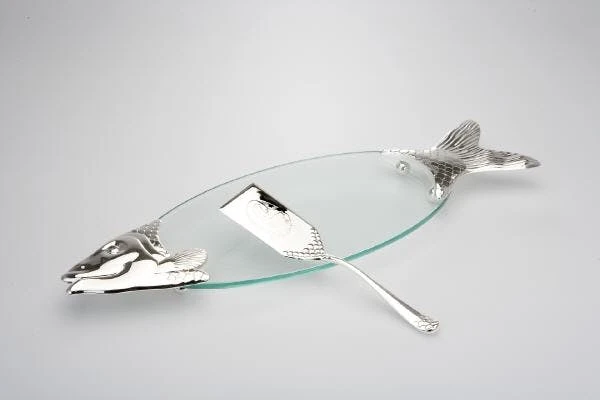 Fischförmige Platte mit ovalem Glaseinsatz, versilbert und anlaufgeschĂŒtzt. Der Heber ist ebenfalls versilbert. Die Glasplatte ist pflegeleicht, da das Glas trennbar ist. Die Platte hat eine MaĂe von 58 x 19 cm und der Heber iene LĂ€nge von 26 cm.
