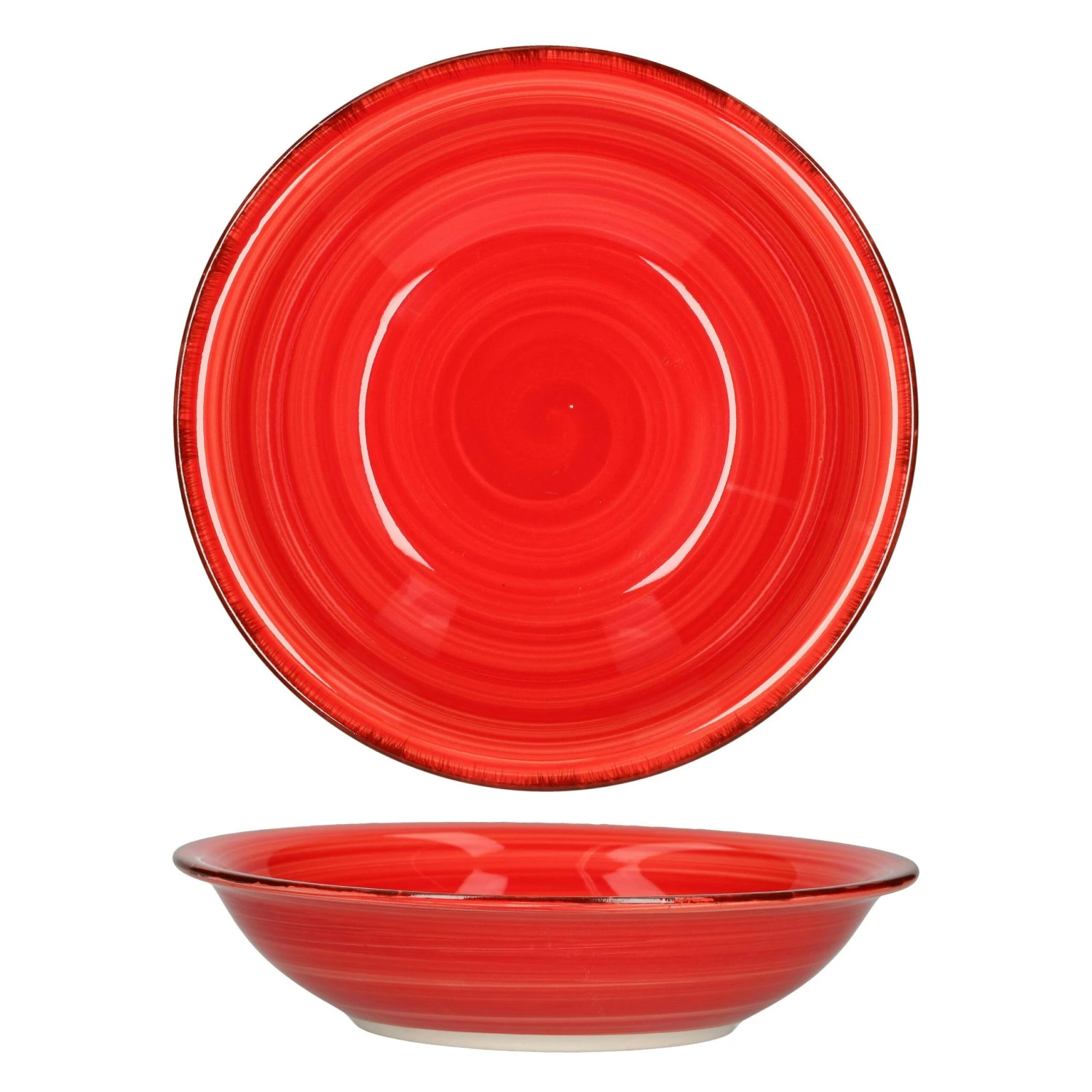 - Jeder der Teller ist in einem warmen Rot gehalten, welches oben und unten mit einem Strudel-Dekor versehen ist und durch den braunen Rand abgeschlossen wird
