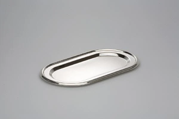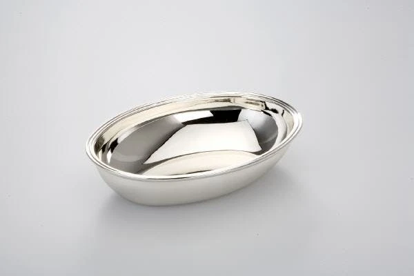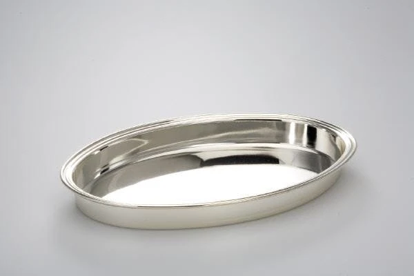 Ovale Sschale mit glatter Oberfläche, versilbert und anlaufgeschützt. Die Höhe der Schale ist 4,5 cm und die Größe beträgt 22 x 16 cm.
